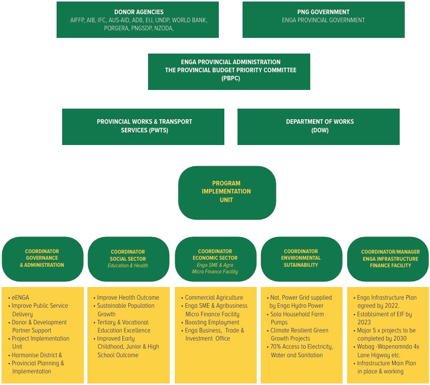 Enga implementation requires a high quality functional enabling institutional environment as it demands the management of a portfolio of projects instead of individual projects. The management of the strategy depends on clearly defining the central oversight and implementation agency roles. These include the Enga Provincial Government, Enga Provincial Administration, National Government Departments; Agencies; State Owned Enterprises; Financiers; Development Partners; the Private Sector; Faith Institutions; Civil Society and not least, the Community of Enga.